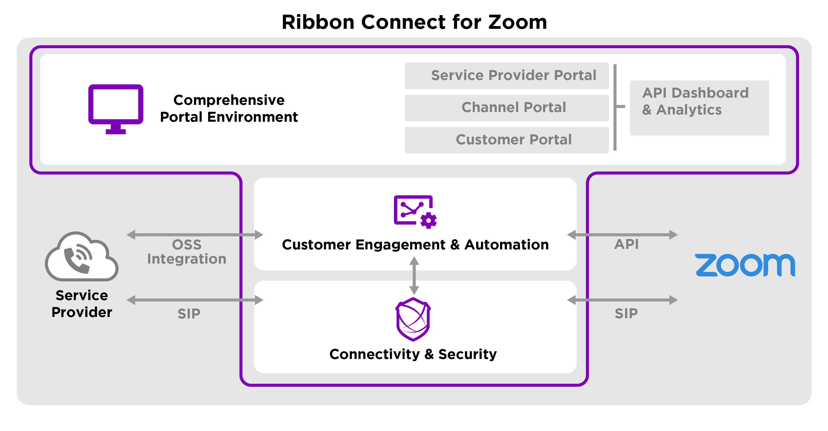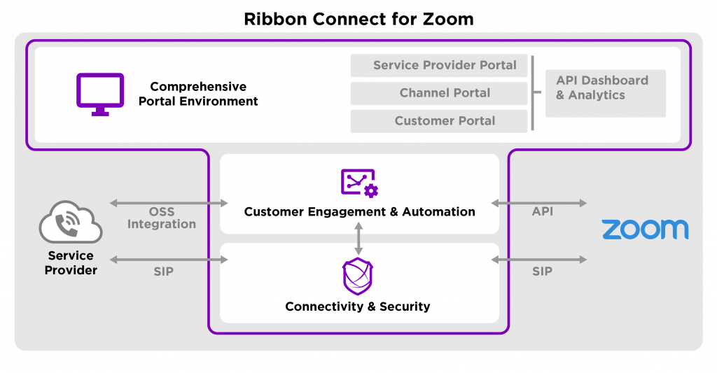 Ribbon Connect for Zoom is a certified Platform Provider that includes a robust multi-level portal and pre-built integration services. Carriers don’t need to spend 9 to 18 months undertaking an API integration effort. Ribbon Connect dramatically reduces OSS/BSS integration and provides a self-service portal that reduces deployment and support costs.