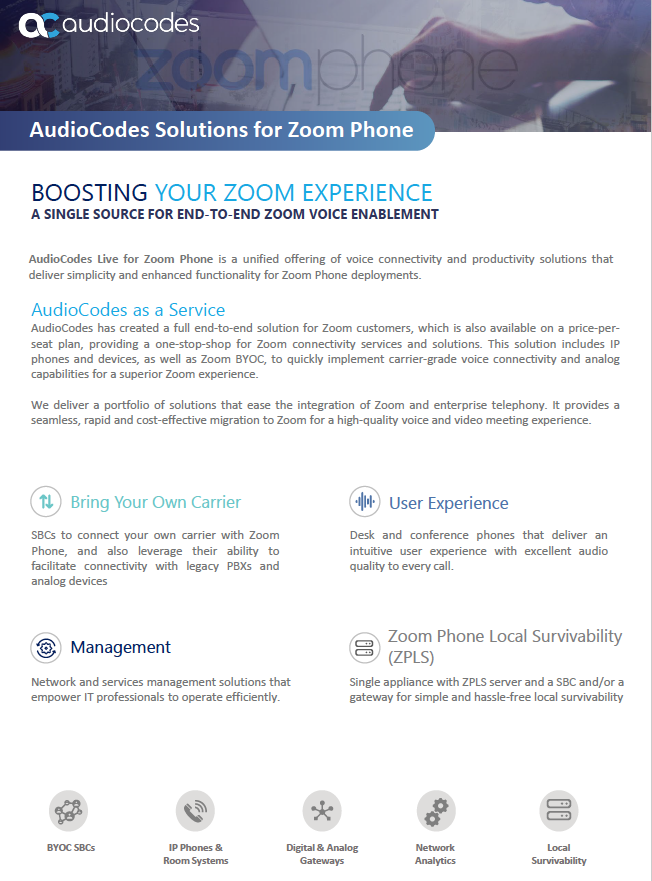 AudioCodes’ high-definition voice products, including IP phones and meeting room solutions, offer superior quality while streamlining end-user communications. They enable full interoperability with existing analog devices and legacy PBXs thanks to the best cloud-based technology and service capabilities, and include automated provisioning so that Zoom Phone customers can begin making calls as quickly, as easily and as affordably as possible.