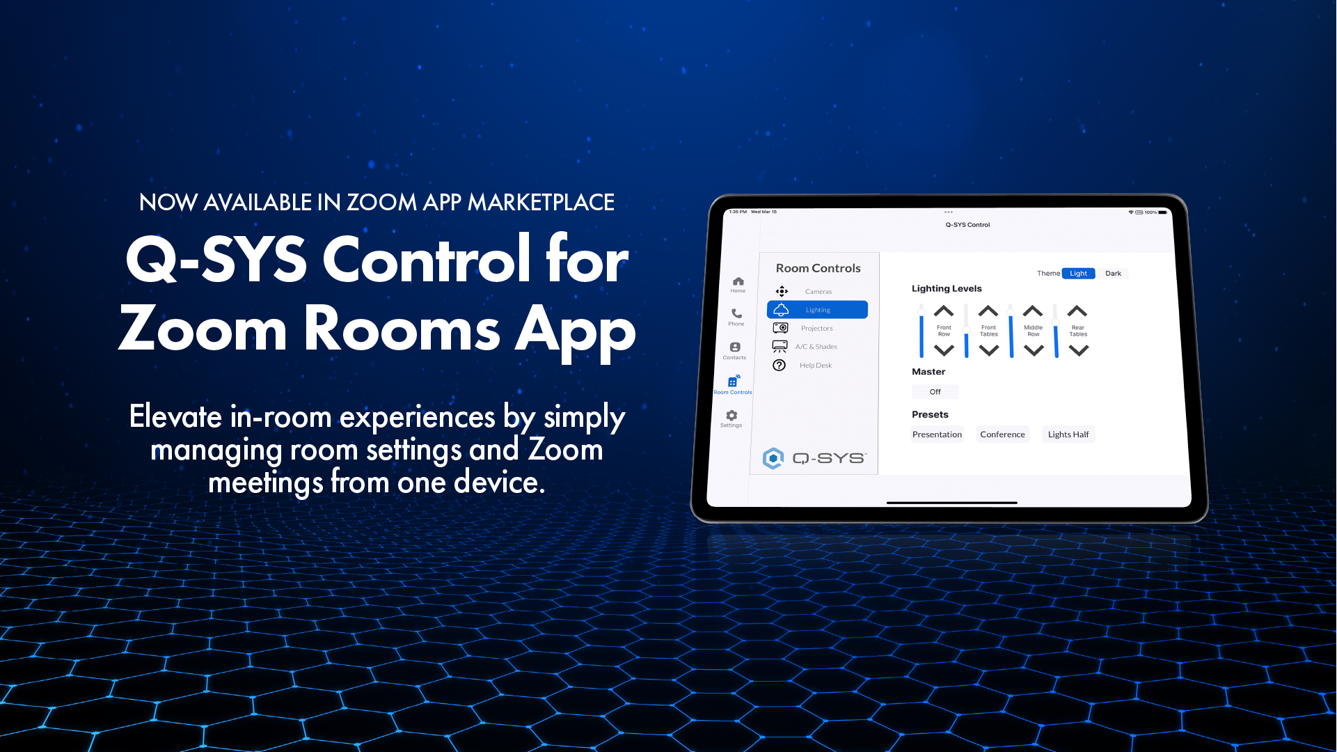 Leverage advanced features including room automation, spatial audio, AI-based presenter tracking, active talker switching, and control it all within the Q-SYS Control for Zoom Rooms app.