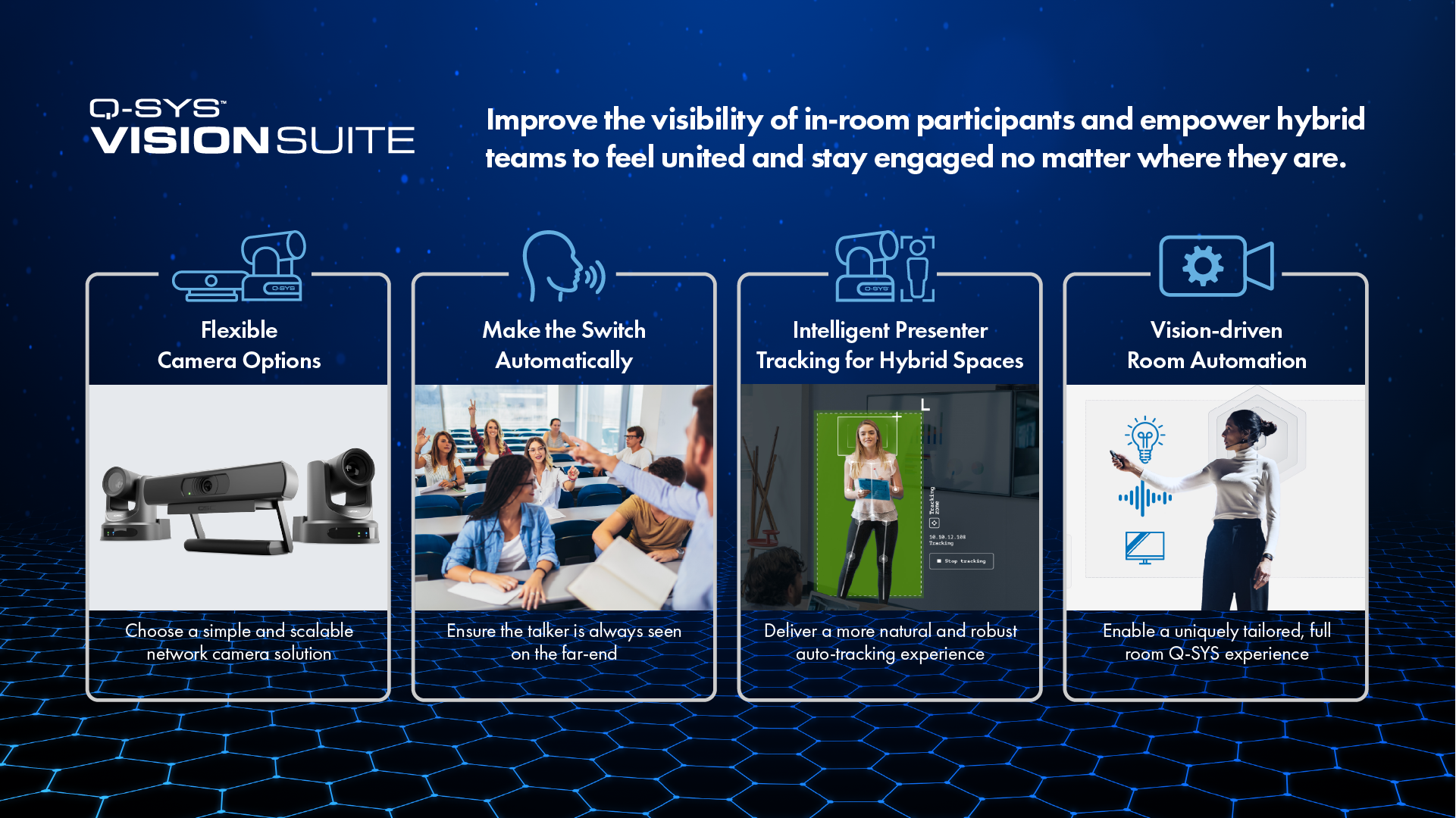 Q-SYS is a cloud-manageable audio, video and control (AV&C) Platform built around a modern, standards-based IT architecture. With established solutions across corporate, education, hospitality, venues & events, cinema, government, healthcare, and transportation, Q-SYS redefines what is possible for live and virtual experiences by uniting hardware and software partners, developers, and creators.